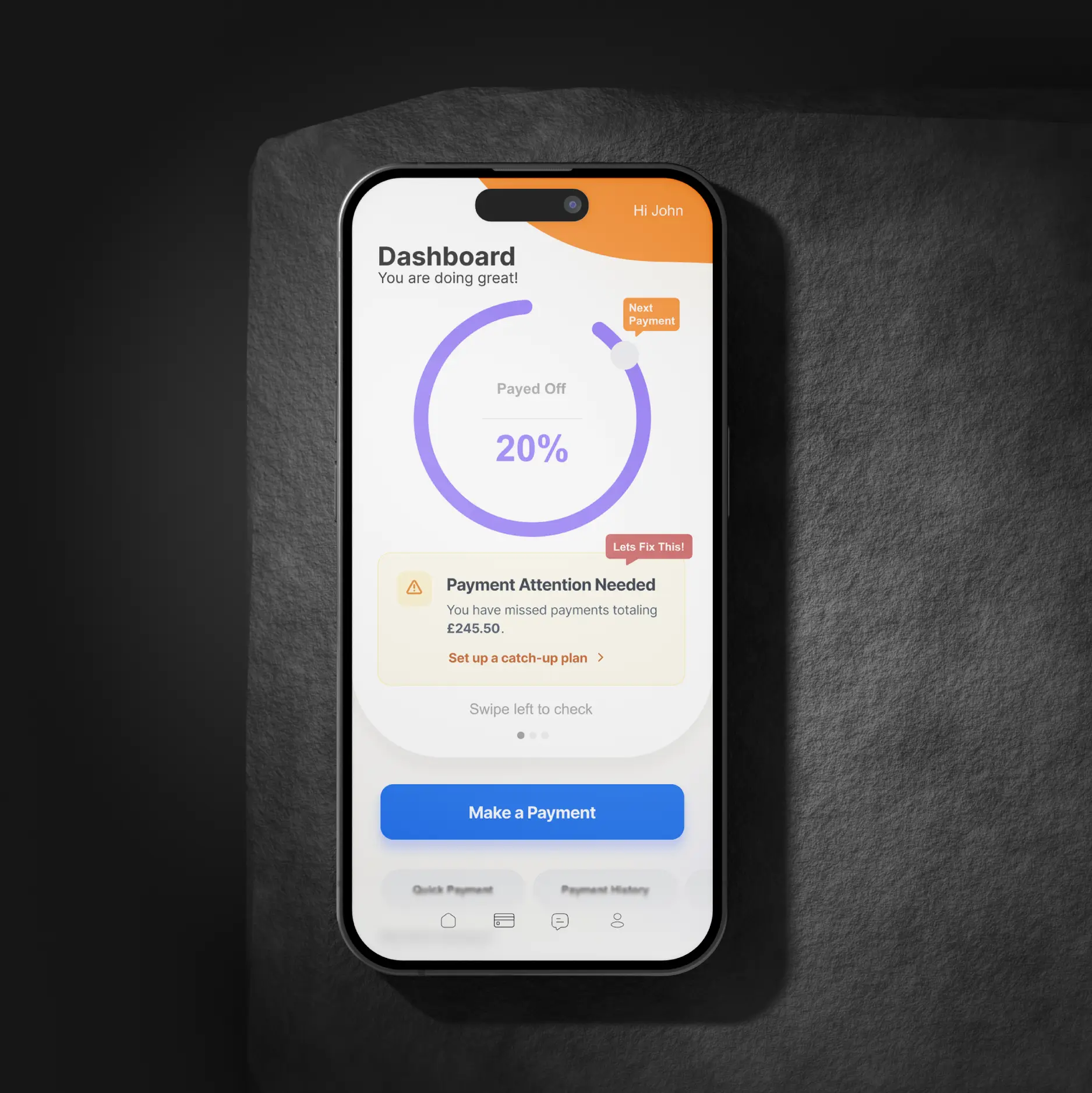 This design reframes missed payments as solvable, reducing shame and encouraging engagement.