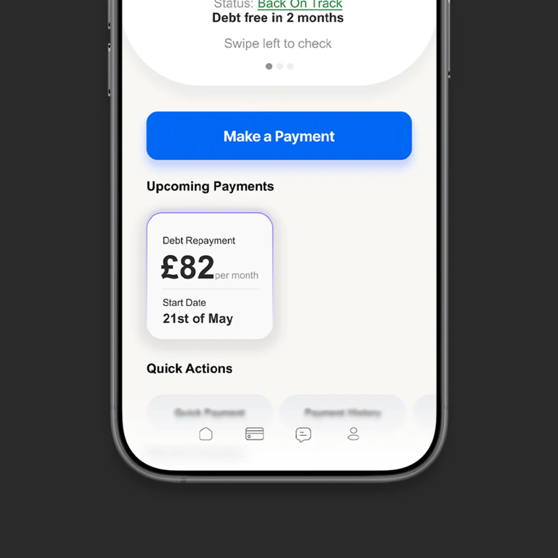 Missed payments trigger a non-judgemental prompt, guiding users toward recovery rather than avoidance.